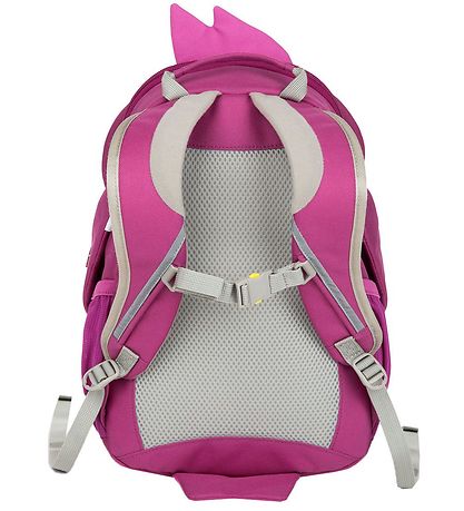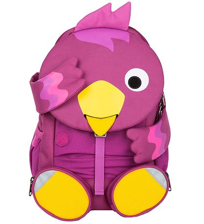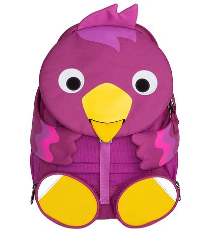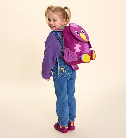 Smart Affenzahn Rucksack in Lila Lila- und Nuancen, geformt wie ein Vogel. Vorne sind zwei Augen und eine Zunge. Die Zunge ist mit einem Gummiband befestigt, und wenn man daran zieht, kommt ein Namensschild zum Vorschein. An den seiten befinden sich ausklappbare Hände und unten kleine Füßchen.