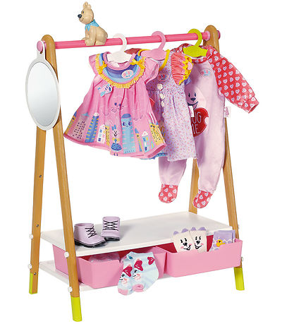Feines Baby Born Puppenzubehör in Form eines Kleiderständers mit Beinen in Holzoptik, einer pink Kleiderstange und zwei weißen Regalen sowie zwei pink Schubladen für die Regale.