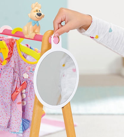 Der Baby Born Kleiderständer wird mit drei bunten Kleiderbügeln, einem runden Spiegel zum Aufhängen und Abnehmen und einer niedlichen Hundefigur geliefert, die auf der Kleiderstange platziert werden kann