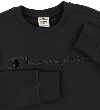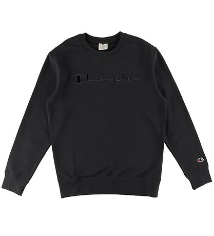 Cool Champion Fashion Sweatshirt in Schwarz mit dem gestricktem Namen"Champion" auf der Vorderseite und dem Markenlogo in den Originalfarben auf dem linken Ärmel.