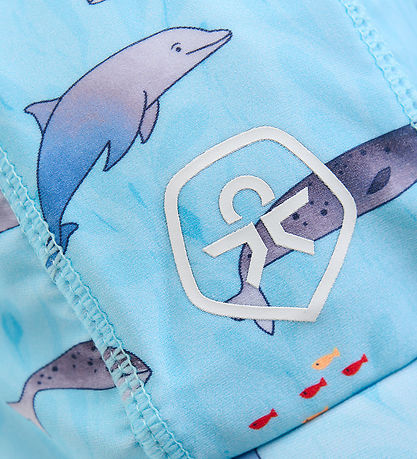 Lovely Color Kids Bademütze in Hellblau mit einem süßen Print verschiedener Wale und Fische.