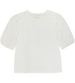 Schön Creamie T-Shirt in Cremefarbig mit einem Print aus grünen und lila Blumen in Form eines Regenbogens auf der Brust. Das T-Shirt hat einen Rund Ausschnitt und kurze Puffärmeln.