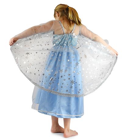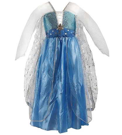 Wunderschönes Den Goda Fen Kostüm, das ein Prinzessinnenkleid mit Eisblau, transparenten Ärmeln und Schleier darstellt, das mit Schneeflocken in Silber und Kanten in Silberstickerei verziert ist. In der Mitte der Brust befindet sich auch ein schön Stern in Silber.