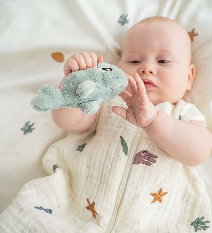 Schöne Done by Deer Rassel in Form eines weichen, hellblauen Wals mit schönen große Augen. Der Wal heißt Wally und möchte der neue beste Freund Ihres Kindes sein.