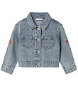 Die Jeansjacke Emporio Armani ist ein kurzes Modell, das bis zur Taille reicht. Es hat lange Ärmel mit breiten Kanten, die mit einem Knopf geöffnet werden können. In der Halsöffnung befindet sich ein Kragen und die Jacke wird mit einem Kragen geöffnet. Unten befindet sich ein breiter Gummirand. Vorne befinden sich praktische, offene Taschen und oben zwei Cheat-Taschen mit Patte und Knopf.