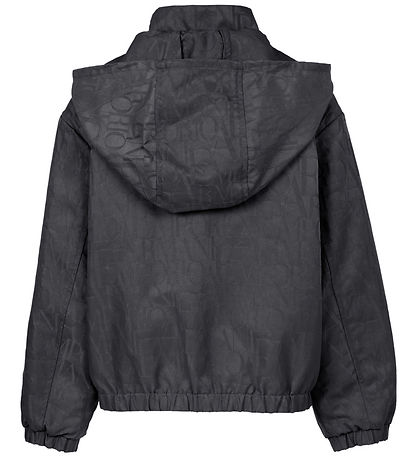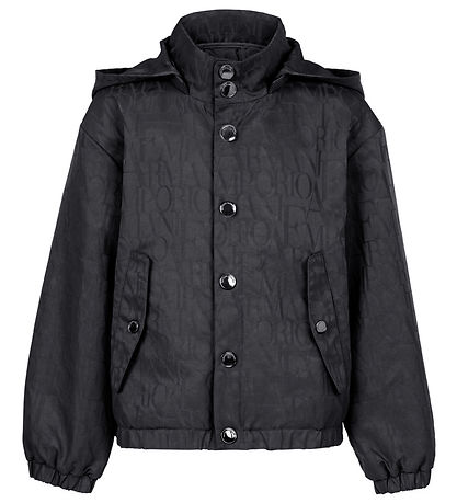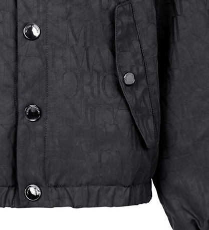 Ansprechender Jacke von Emporio Armani in dunklem navy mit einem Allover Muster aus dem Namen"Emporio Armani", das in den Stoff gewebt ist.