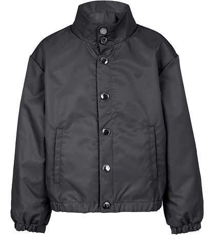 Die Jacke von Emporio Armani hat eine abnehmbare Kapuze, die mit einem versteckten Reißverschluss gesichert ist. Die Ärmel und der Saum hat einen schmalen Gummikanten und die Jacke wird mit silbernen Druckknöpfe geöffnet. Vorne befinden sich zwei Pattentaschen, die mit einem Druckknopf geschlossen werden. Die Jacke hat ein einfarbiges Kammgarnfutter in Navy und ist ohne Wattierung, sodass sie in den wärmeren Monaten als Oberbekleidung geeignet ist.