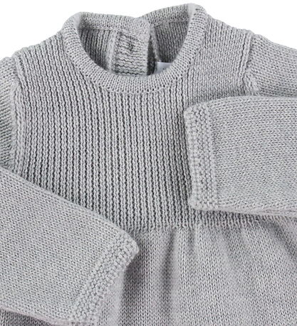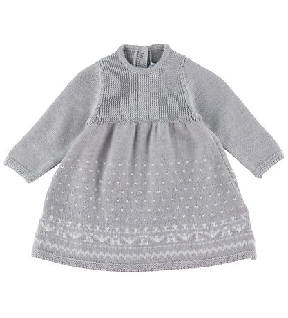 Schön Emporio Armani Kleid in meliertem Grau mit einem feinen, Weiß Muster am unteren Rand. Das Kleid ist in gestrickter in blitzblanker Wollqualität gefertigt.