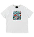 Ansprechender Emporio Armani T-Shirt in Puder mit smart Print auf der Vorderseite, der eine Malerbluse mit Pinsel in der Tasche darstellt.