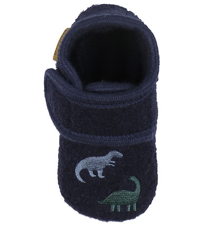Coole En Fant Hausschuhe in Navy Wolle, und am Fuß sind zwei in Blau und Grün gestricktem Dinosaurier angebracht.