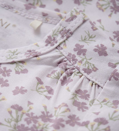 Süßer Fixoni Body in hellem mit Allover-Blumenprint in Lila und Nuancen. Der Body hat einen Rund mit Druckknöpfe an beiden Schultern und kurze Ärmel. Er wird mit Druckknöpfe zwischen den Beinen geschlossen.