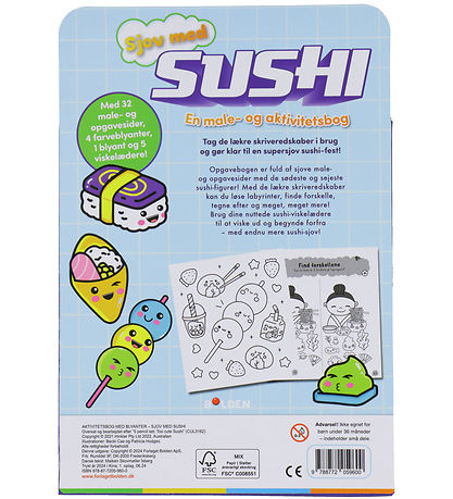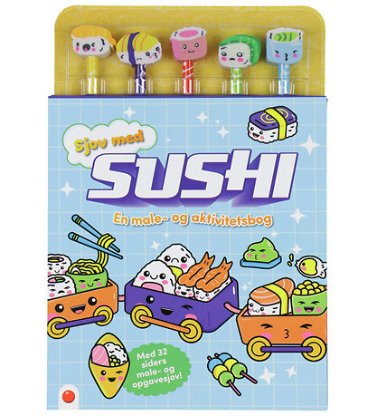 Lustiges Mal- und Aktivitätsbuch von Forlaget Bolden zum Thema „Spaß mit Sushi“ sowie fünf mitgelieferte Bleistifte (1 normaler, 4 farbige) mit große Radiergummis am Ende.