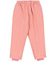 Feine Konges Sløjd Thermohosen in Hellrosa, mit einem Allover-Blumendruck in Rosa- und Grünnuancen und mit einer Lochstruktur im Stoff.