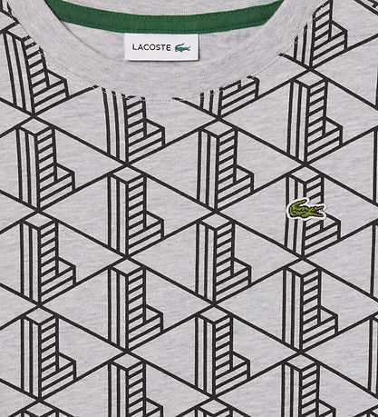 Ansprechender Lacoste T-Shirt mit kurzen Ärmeln in einem hellen Grauton, verziert mit einem stylischen Geometrisk Muster in Schwarz. Das gestricktem Lacoste -Logo ist dezent auf der Brust des T-Shirt aufgestickt.