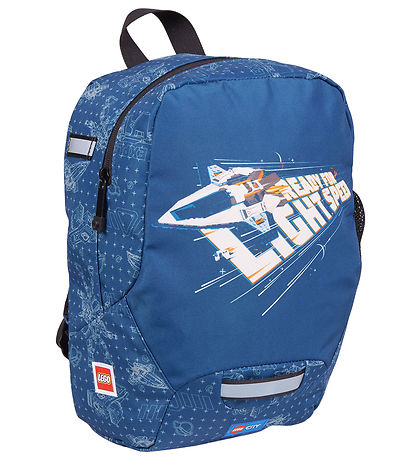 Schön LEGO® Kindergartentasche in Blau mit einem Print von Motiven aus dem Weltraum und dem Text „Ready For Light Speed“ in Weiß.