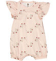 Süßer Lil' Atelier Sommerstrampler in Cremefarbig mit grünem Frosch- Print. Der Sommerstrampler hat einen Rund mit Knöpfen vorne und kurze Ärmel. Er hat kurze Beine und wird zwischen den Beinen mit Druckknöpfe geschlossen.