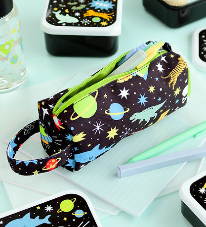 Smart Federmäppchen A Little Lovely Company in Schwarz mit Allover-Print in Hellblau, Grün, Orange und rot mit Sternen, Sternschnuppen und UFOs sowie Haien, Tigern und Dinosauriern.