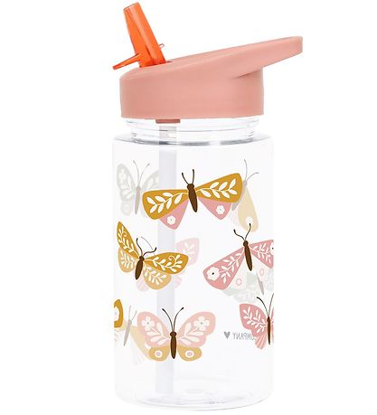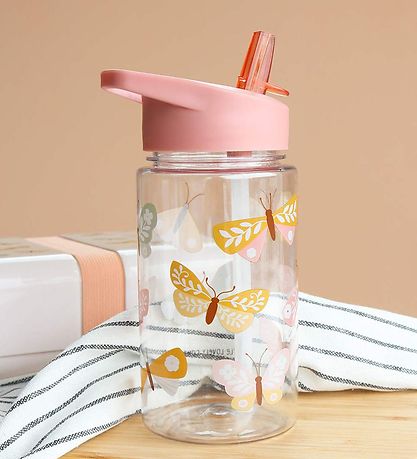 Schöne A Little Lovely Company Trinkflasche aus transparentem Plastik mit einem Print von rosa und gelben Schmetterlingen und dem Deckel ist rosa.