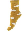 Wunderschöne Melton Socken in Pink mit feinem Strickmuster und goldfarbenen Glitzerfäden. Oben haben sie eine Rüschen.