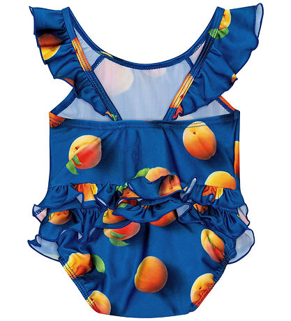 Cooler Molo Badeanzug in Blau mit Aprikosen- Print. Der Badeanzug hat einen Rund Ausschnitt und schmale Schulterträger mit Rüschendetails an den Schultern. An der taille befinden sich Rüschen und in den Beinöffnungen Gummizüge, die für eine gute Passform sorgen.