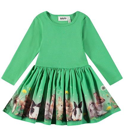 Erfrischendes Molo Kleid in einem schönen Grün. Das Kleid hat lange Ärmel und einen fröhlichen Print mit süße Kaninchen auf dem Rock. Das Teil hat schön Rippbündchen und der Rock ist aus einer leichten, dicht gewebten Qualität gefertigt.