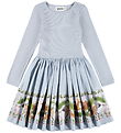 Wunderschönes Molo Kleid mit langen Ärmeln in einem dunkelblauen Farbton. Das Kleid hat ein einzigartiges Stillmuster mit Waldmotiv und Pilzdruck in bunten Nuancen auf dem Rock. Das Design vereint Komfort mit einem verspielten Ausdruck.