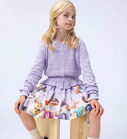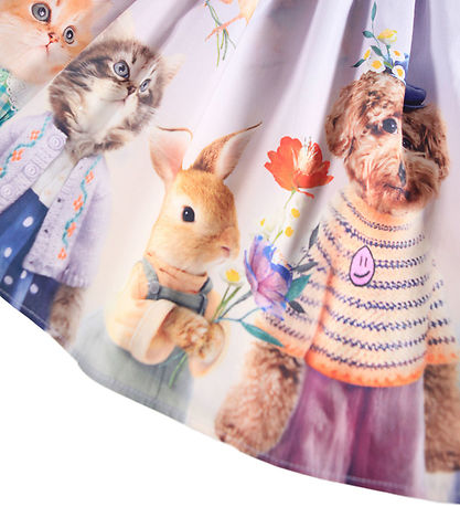 Einladendes Molo Kleid in Blass lila. Das Molo Kleid hat lange Ärmel und einen Rund Ausschnitt im gerippten Oberteil. Der Rock ist mit detaillierten Bildern von kleinen Tieren in bunten Pullovern verziert und verleiht ihm einen lebendigen und einzigartigen Look.