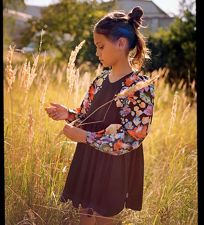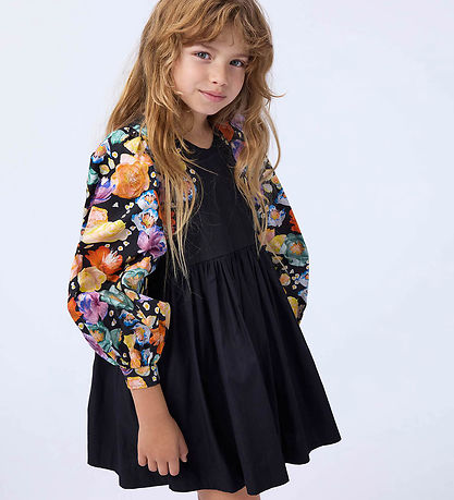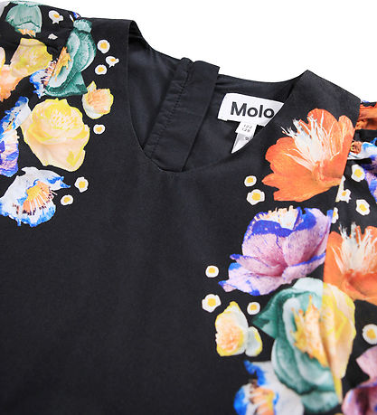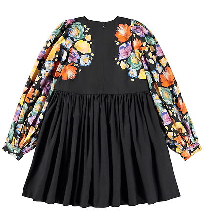 Schön Molo Kleid in Schwarz mit farbenfrohen Blumenmotiven an den Ärmeln. Das Molo Kleid hat lange Ärmel und eine taillierte Passform, die dem Rock einen eleganten Fall verleiht. An den Handgelenken enden die Ärmel mit einem Schöne Knopfverschluss und am Hals wird das Kleid mit einem Reißverschluss geschlossen.