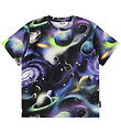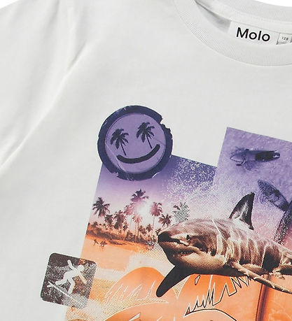 Cooles Molo T-Shirt mit einem Print auf der Vorderseite aus verschiedenen Meeres- und Strandmotiven in Lila, Orange- und Nuancen. Das T-Shirt hat einen Rund Ausschnitt mit schmaler gerippter Rand und kurze Ärmel.