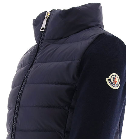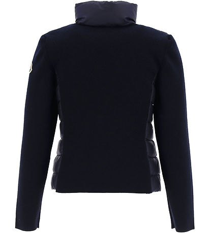 Ansprechender Cardigan von Moncler in einfarbigen navy. Oben am linken Ärmel befindet sich ein klein Filz- mit einem Logo.