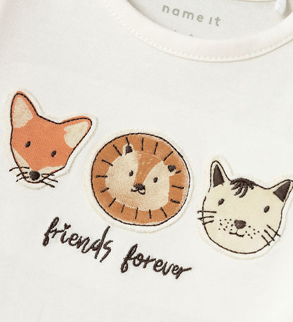 Hübscher Name It Body mit langen Ärmeln in einem Beigeton, verziert mit einem süßen Print aus drei Tieren und dem Text"friends Forever" auf der Vorderseite. Perfekte Wahl für die Kleinen.
