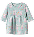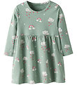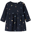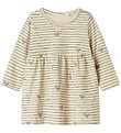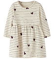 Süßes Name It Kleid in einem hellen Cremeton mit dunkelblauen Streifen und kleinen Herzen. Das Name It Kleid hat lange Ärmel und einen Rund Ausschnitt. Es ist in der Taille leicht gerafft, was dem Rock eine Schöne Struktur und einen leichten Fall verleiht. Das Kleid wird mit versteckten Druckknöpfe an der linken Schulter geöffnet.