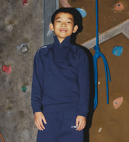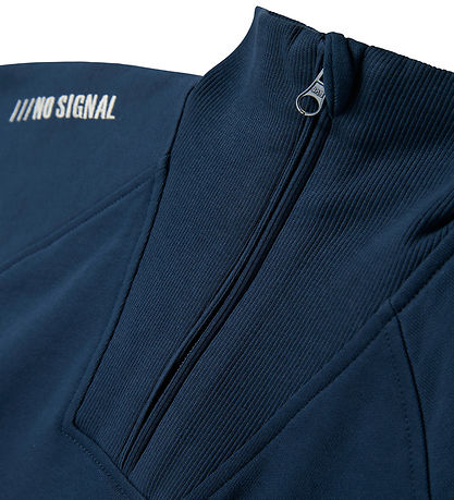 Smart Name It Sweatshirt in Marineblau mit hohem Kragen und kurzem Reißverschluss vorne. Auf der rechten Schulter ist der Text "No Signal" in Weiß gestricktem. Das Name It Sweatshirt hat lange Ärmel und Gerippte Kanten. Innen befindet sich weiche, gebürstete Baumwolle.