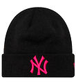 Wunderschöne New Era Strickmütze in Schwarz mit stickat Rippenstruktur und einen lila New York Yankees- gestricktem auf der Vorderseite. Auf der linken Seite befindet sich außerdem ein New Era -Logo.