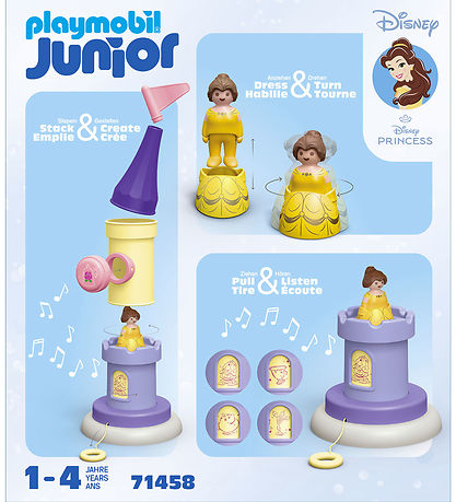 Lustiges Playmobil Junior Set mit 7 Teile, die sich zu Belles Spielturm mit Sound zusammenbauen lassen.