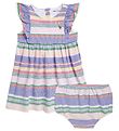 Das Kleid von Polo Ralph Lauren ist ganz ohne Ärmel und hat süße Rüschen in den Armausschnitten. Der Rock hat viel Weite und rundherum schöne, breite Falten. Am Halsausschnitt öffnet sich das Kleid mit einem stoffbezogenen Knopf. Ein Paar bloomers in Navy Baumwolljersey sind im Lieferumfang enthalten und hat einen schmalen elastische Abschlüsse.