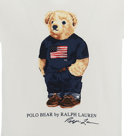 Schöne Schlafanzug von Polo Ralph Lauren, bestehend aus einer Schlafhose und einem T-Shirt. Die Schlafhose hat einen schmalen, vertikale Streifen in Weiß und Hellblau und einen Print von kleinen Kuscheltiere in navy Kleidung. Das Schlafshirt ist weiß mit einem großen Print auf der Vorderseite eines braunen Kuscheltier, der navy Kleidung trägt.