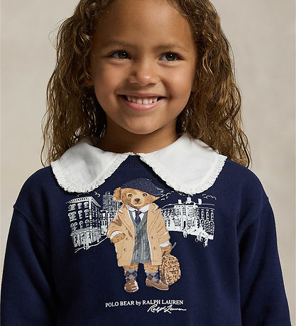 Elegantes Polo Ralph Lauren Kleid in Navy Sweatstoff mit einem Print auf der Vorderseite mit einem stylisch gekleideten Kuscheltier vor einer Stadt. Das Sweatkleid hat lange Ärmel mit breiten Gerippte Kanten und die Taille kann mit einem weißen Schnürsenkeln enger gestellt werden. Der Rock fällt unten schön weit und an den seiten befinden sich praktische Taschen. Das Sweatkleid besteht innen aus weicher, gebürsteter Baumwolle.
