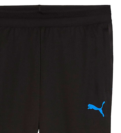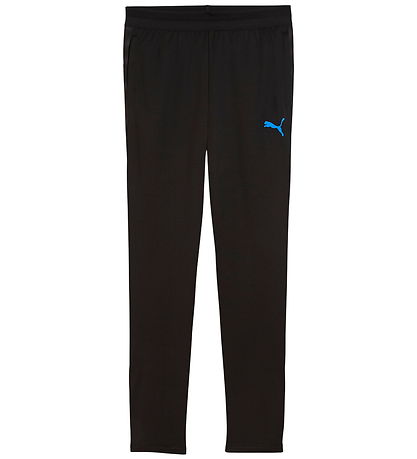 Schöne Puma Trainingshose in einfarbigen Schwarz mit klein blauen Puma Logo. Die Puma Trainingshosen hat lange, eng anliegende Beine mit einem kurzen Reißverschluss unten. Der Bund hat einen breiten Gummirand, der innen mit einem Schnürsenkeln enger gestellt werden kann. An den seiten befinden sich praktische Taschen mit Reißverschluss. Die Trainingshosen ist aus in glatt gewebter Qualität mit atmungsaktiver Netzstruktur gefertigt.