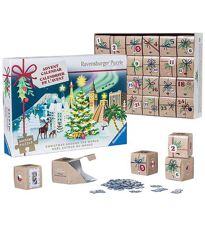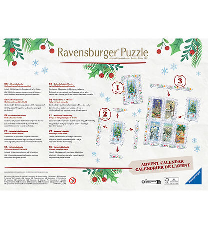 Der Ravensburger Weihnachtskalender besteht aus 24 Puzzlespiel mit jeweils 54 Teile. Die 24 Puzzlespiel lassen sich zu einem großen Puzzlespiel zusammenfügen und Sie können selbst entscheiden, wie sie zueinander platziert werden sollen.