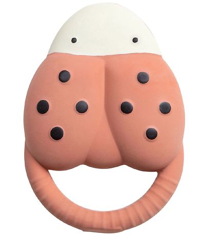 Praktischer Sebra Beißring in Form eines Marienkäfers in Rot mit schwarzen Punkte auf der Rückseite und einem Weiß Gesicht.