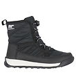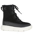 Wunderschöne Sorel Winterstiefel aus schwarzem, glattgewebte Textil und mit Details aus imitiertes Leder. An den seiten befinden sich dekorative schwarze Bänder und die Winterstiefel haben schwarz-weiße Schnürsenkel.