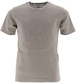 Wunderschönes Stone Island T-Shirt in einfarbigen Beige mit einem großen beigefarbenen Logo, das auf der Vorderseite gestricktem ist.