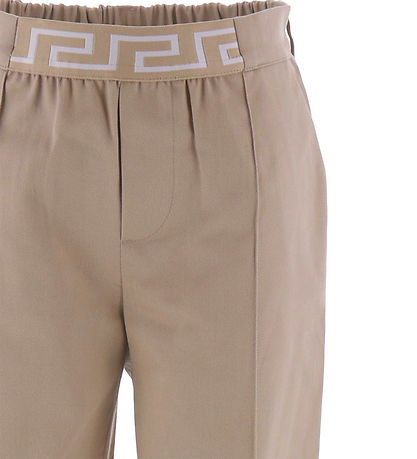 Schöne Versace Hosen in einfarbigen Beige in dicht gewebter Qualität, und in der Taille befindet sich vorne eine weiße Mäanderborte.