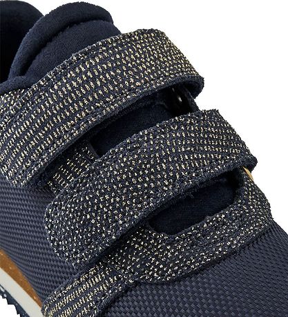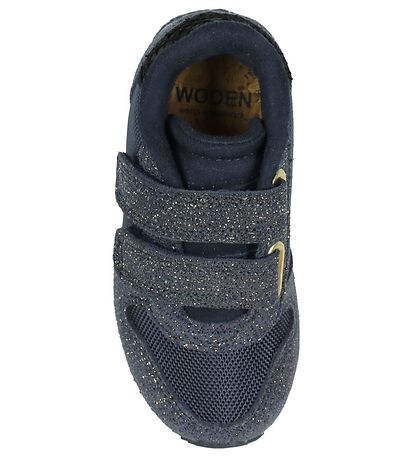 Wunderschöne Woden Schuhe in Navy Mesh mit Wildleder-Details mit silbernem und Goldglitzer und schwarzem Fischleder an der Ferse. Die Laufsohle besteht aus mehreren Schichten in meliertem Braun, Weiß und navy mit weißen Noppen.