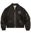 Ansprechender Steppjacke von Wood Wood Kids in glänzemdem Schwarz mit silbernem Logo auf der linken Brust. Das Futter der Bomberjacke ist leuchtend orange.