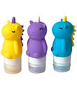 Smarte Yumbox-Dressingflaschen im praktischen 3er-Pack in Lila, Grün und Pink, alle mit einem lustigen monster an der Top.