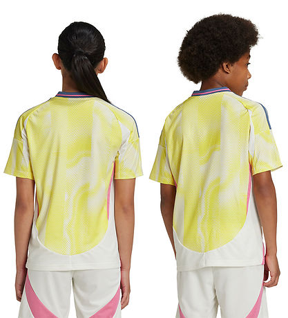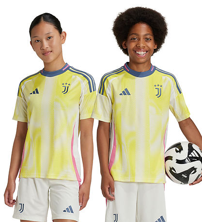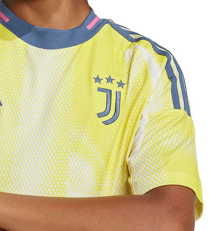 Cooles adidas Performance Fußballtrikot in Gelb und Weiß, mit den klassischen adidas Streifen in Grau auf beiden Schultern, und einen gestricktem Juventus Logo auf der Vorderseite.