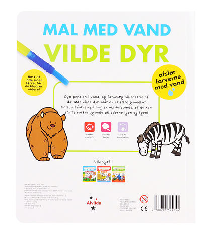Das Alvilda Malbuch besteht aus 12 dicken Seiten mit teils farbigen, teils weißen Illustrationen. Die schönen Farben der weißen Teile lassen sich durch einfaches Eintauchen des Pinsels in Wasser und Ausmalen auf den weißen Teile hervorheben. Auf jeder Seite gibt es eine kurze Geschichte über das, was Sie auf der Seite sehen, und drei Dinge, die Sie finden müssen.
