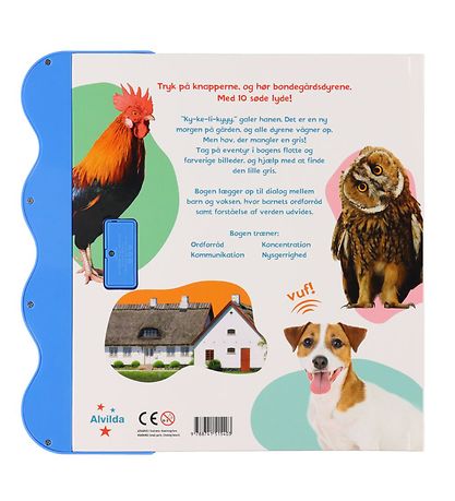 Das Alvilda Buch hat viele schöne Bilder, kurze Texte und zehn verschiedene Sounds. Das Buch ist aus Pappe, so dass es auch dem Kind leicht fällt, die Seiten umzublättern.
